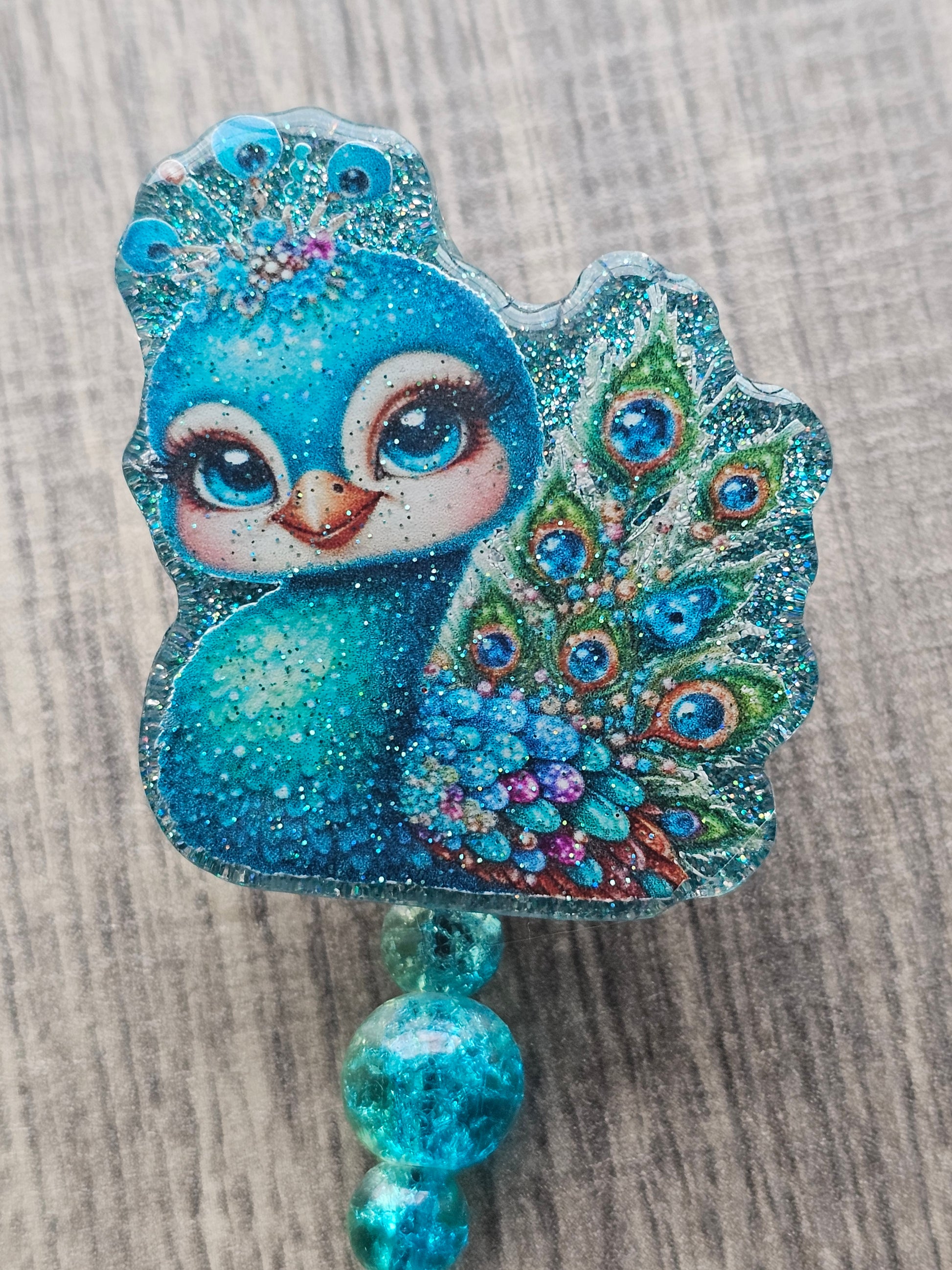Introducing our stunning Aquamarine Majesty Peacock Badge Reel: a captivating accessory that adds elegance and style to your daily routine. This retractable badge holder features a beautiful blue peacock design, perfect for nurses, teachers, and professionals. With its vibrant colors and intricate details, it's sure to make a statement. Order yours today and showcase your unique style!