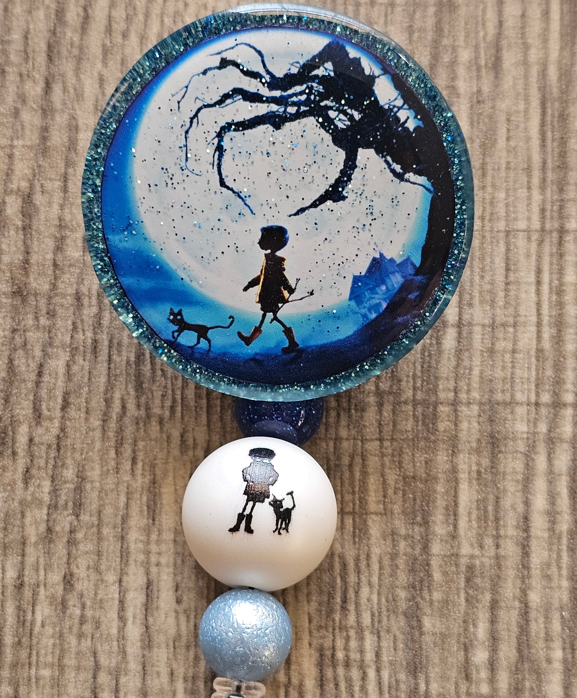 The second design showcases the silhouette of a brave figure walking alongside a cat, framed by a glowing moon and a tree branch that eerily reaches toward her. This badge holder evokes a sense of adventure and suspense, perfect for fans of dark and whimsical tales. Whether you're looking to add a touch of mystery to your workday or make a bold statement, these designs are sure to spark conversation.