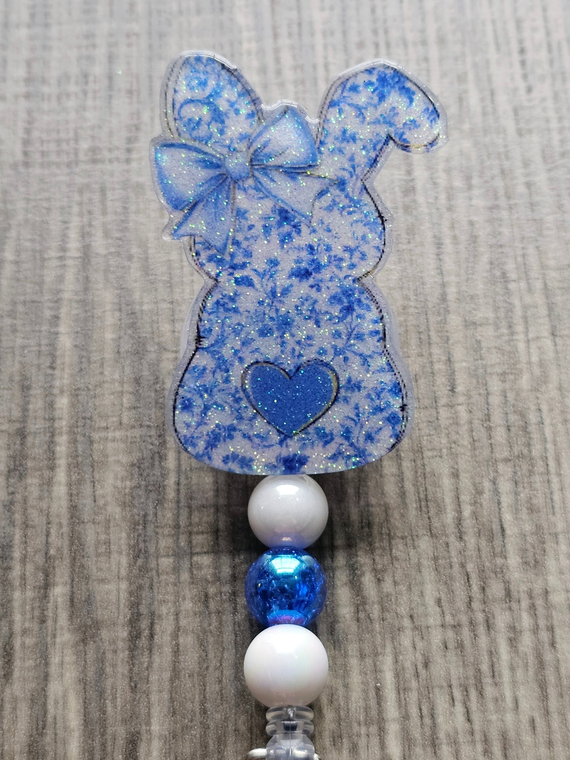 Hop into style with this unique blue and white patterned bunny badge reel! Featuring intricate designs on an adorable bunny silhouette, this reel is perfect for rabbit lovers, spring enthusiasts, and anyone who appreciates artistic accessories. Handmade with UV resin, glitter, E6000 glue, acrylic, a plastic alligator clip reel, and playful plastic beads, this reel is as stylish as it is practical.