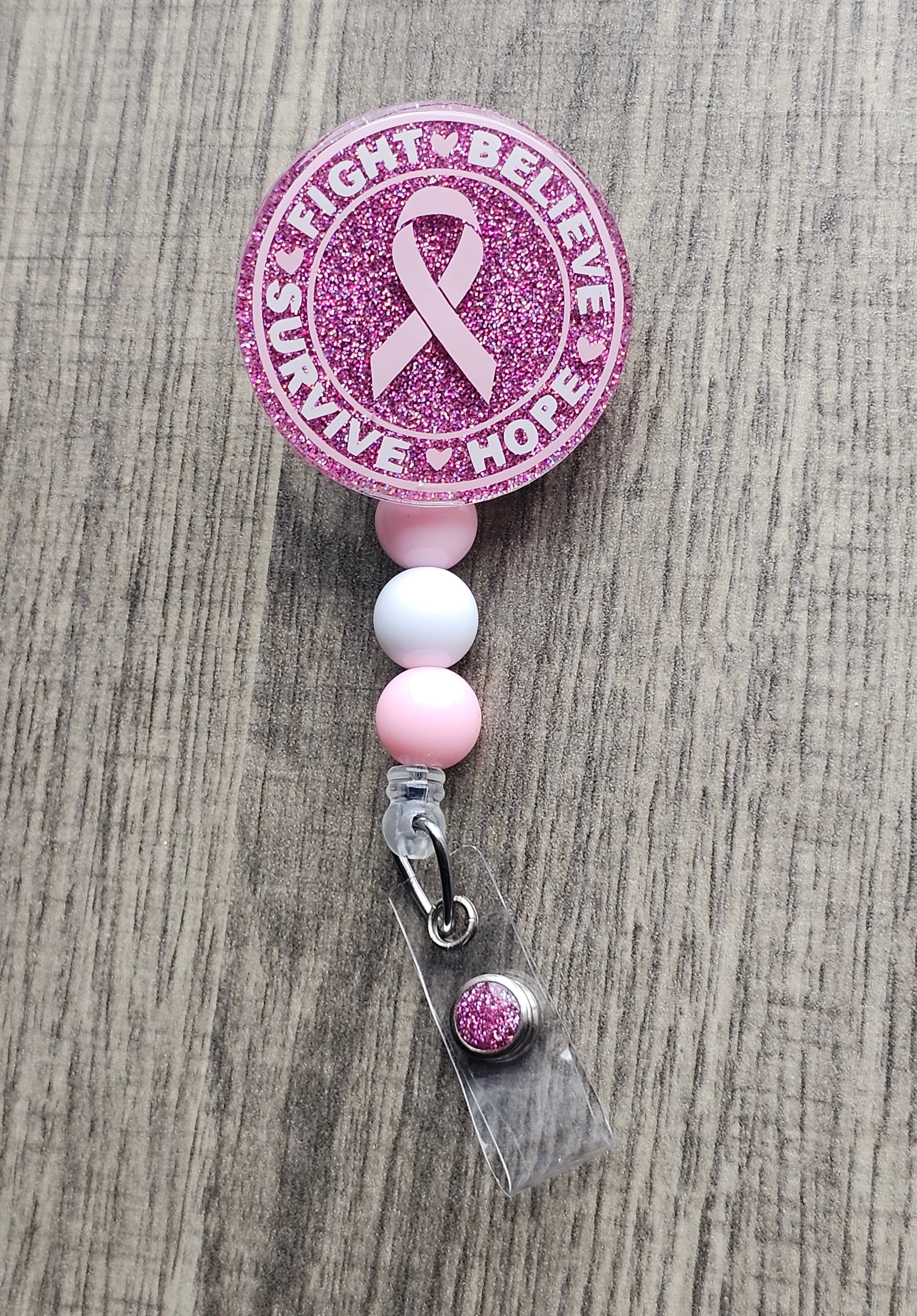 Take a stand against breast cancer with our inspiring Breast Cancer Awareness badge reel, designed to raise awareness and spread hope. Featuring the powerful words "Fight, Believe, Survive, Hope" and the iconic breast cancer awareness symbol at its center, this badge holder serves as a daily reminder of strength and resilience during Breast Cancer Awareness Month.