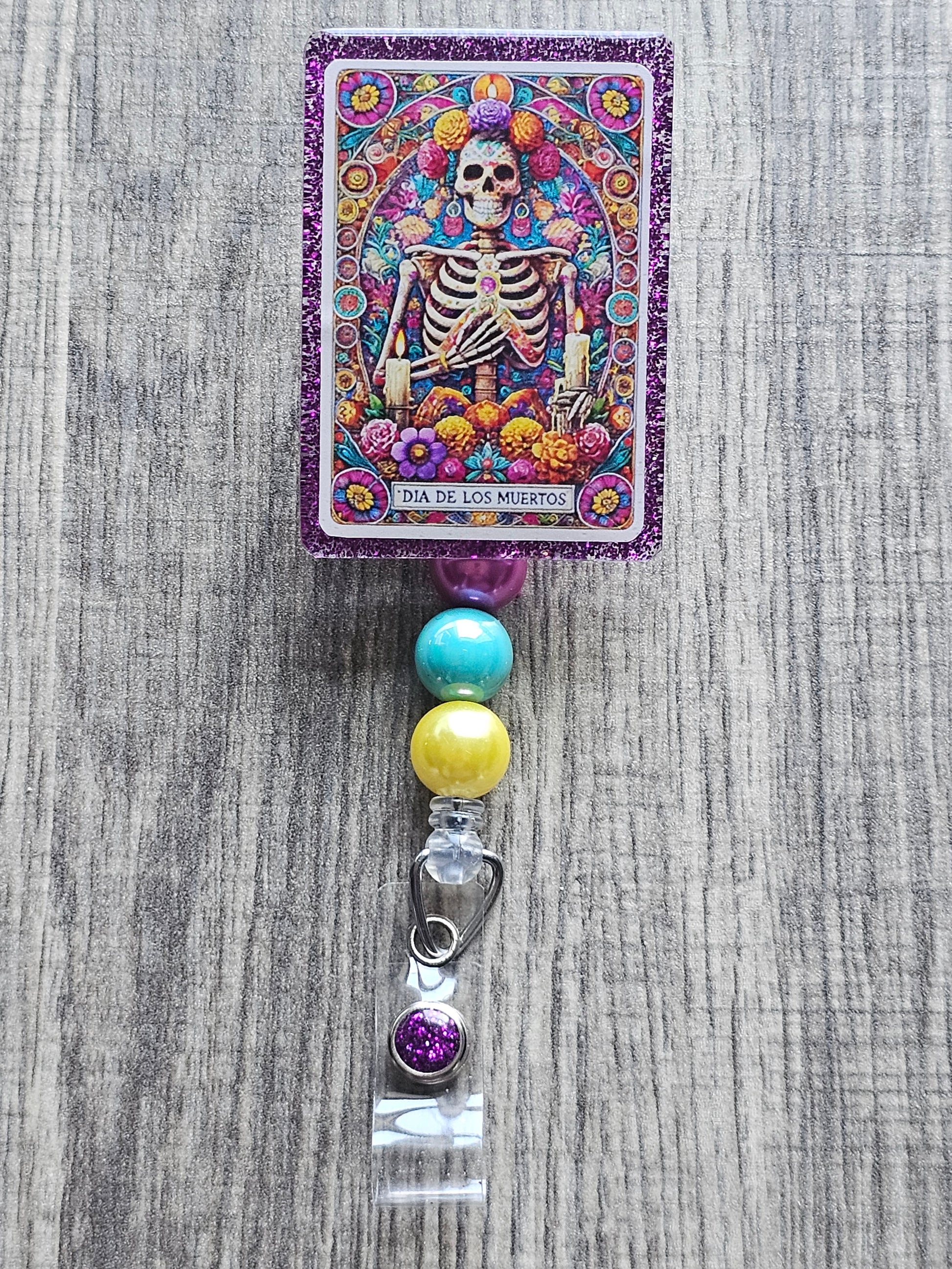 Dia De Los Muertos Tarot Badge Reel: Elegant and Ethereal. This exquisite badge reel features a captivating skeleton surrounded by vibrant flowers and adorned with a stunning flower crown, inspired by the traditional Dia De Los Muertos celebration. Perfect for adding a touch of gothic beauty to your daily essentials.