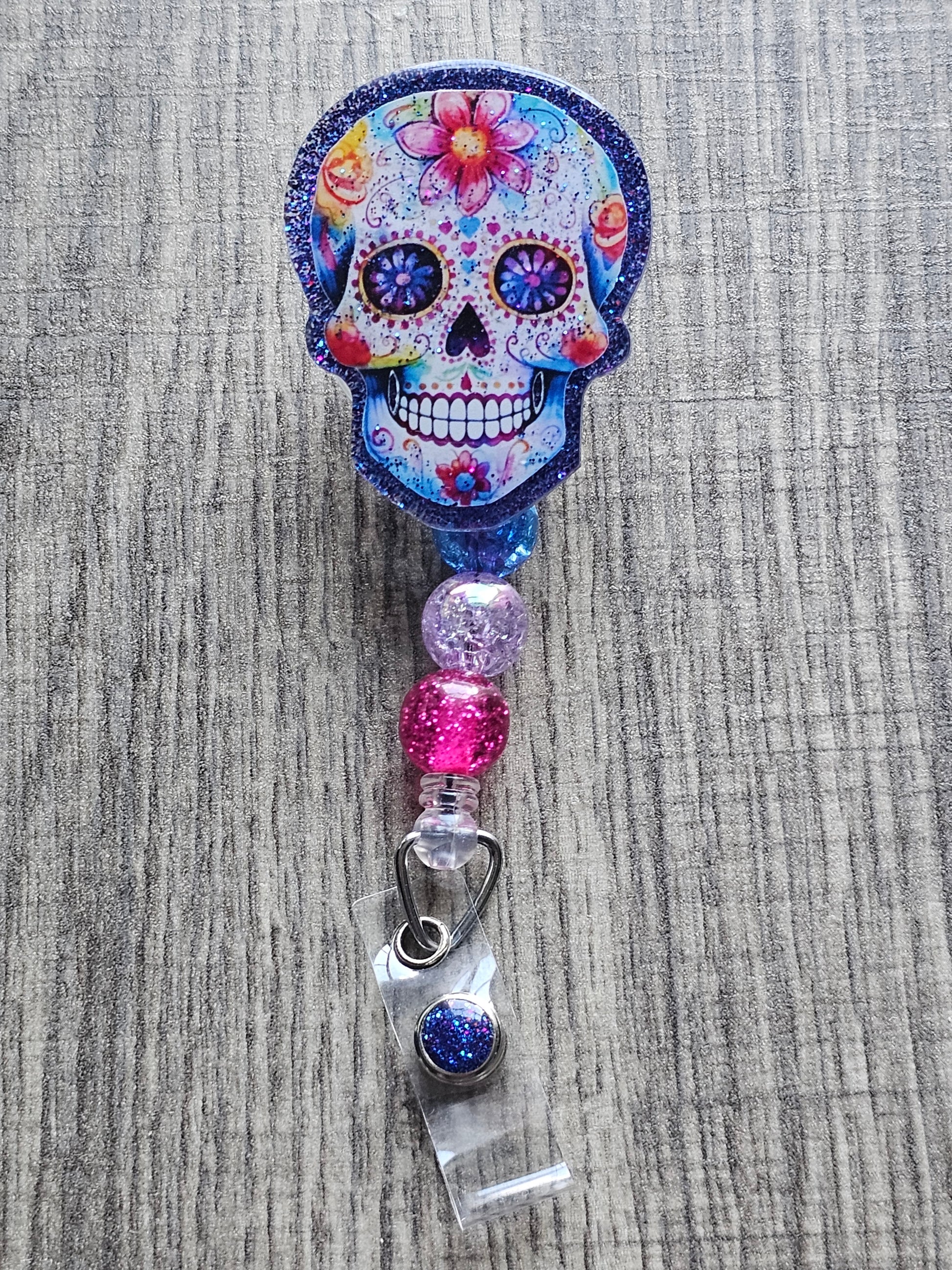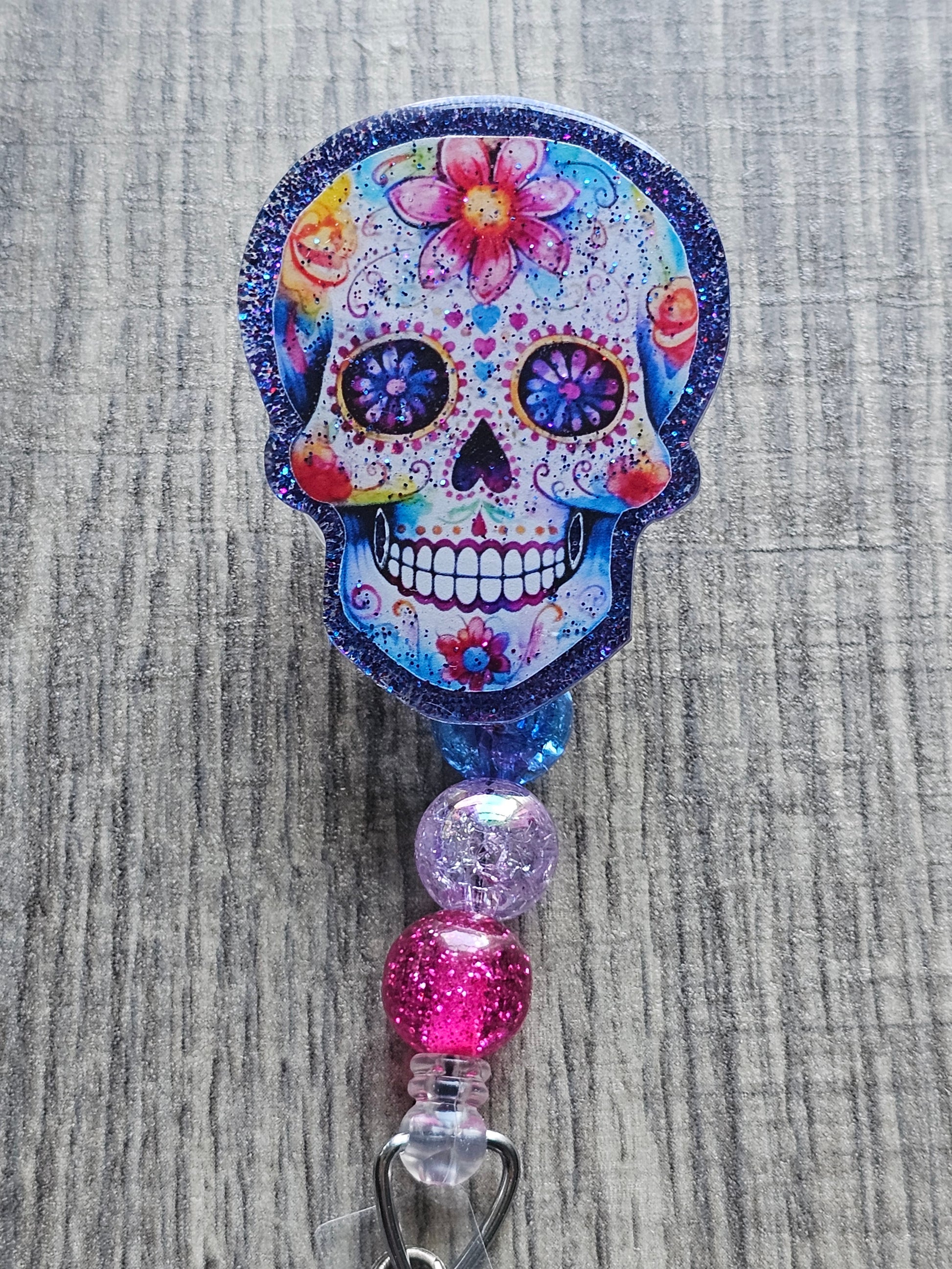 Dia De Los Muertos Skull Badge Reel: A Colorful Celebration. This unique skull-shaped badge reel features a vibrant and intricate design, adorned with flowers, paint, and gems, inspired by the traditional celebration of the Day of the Dead. Perfect for adding a touch of gothic glam to your daily accessories.