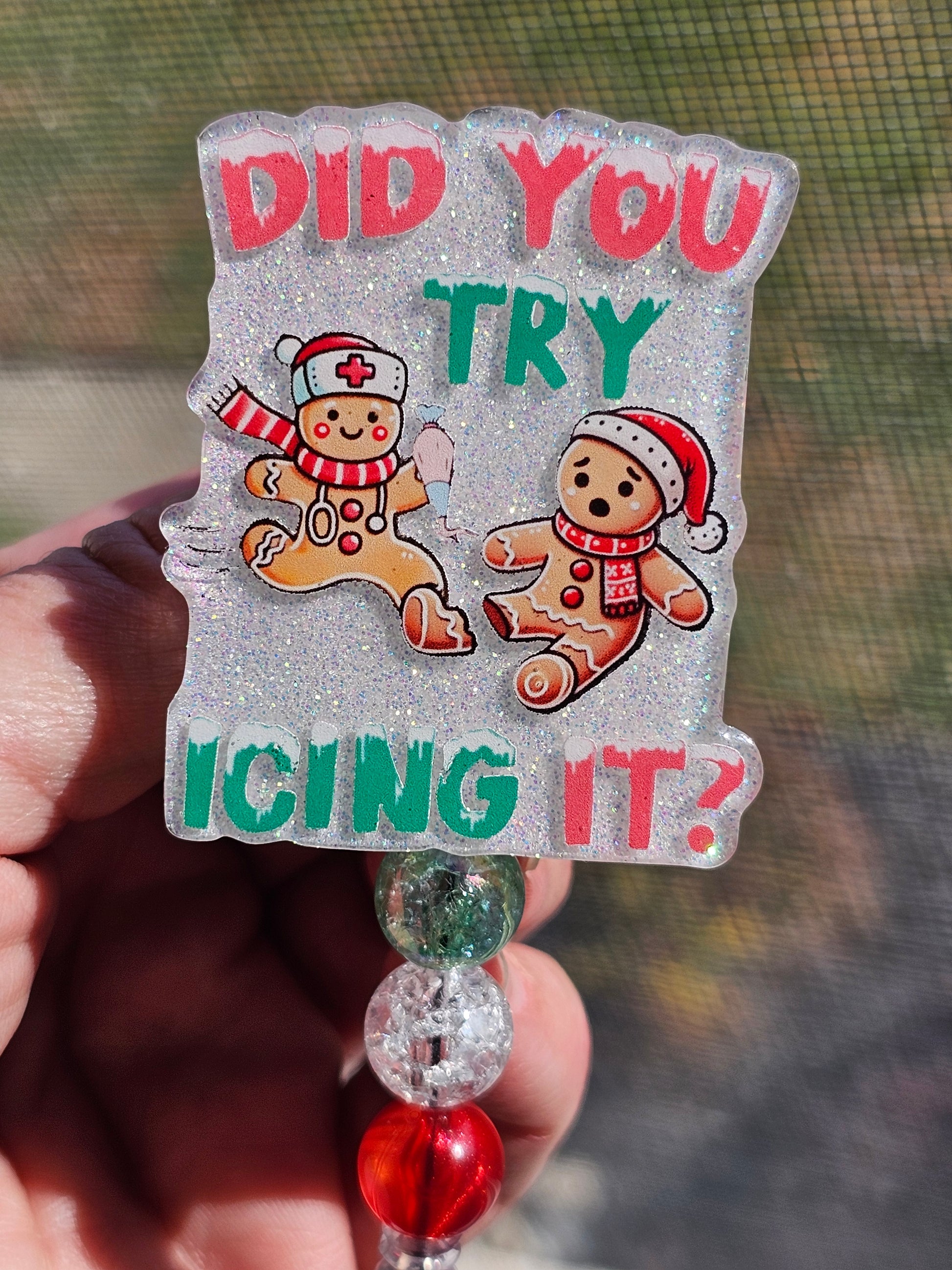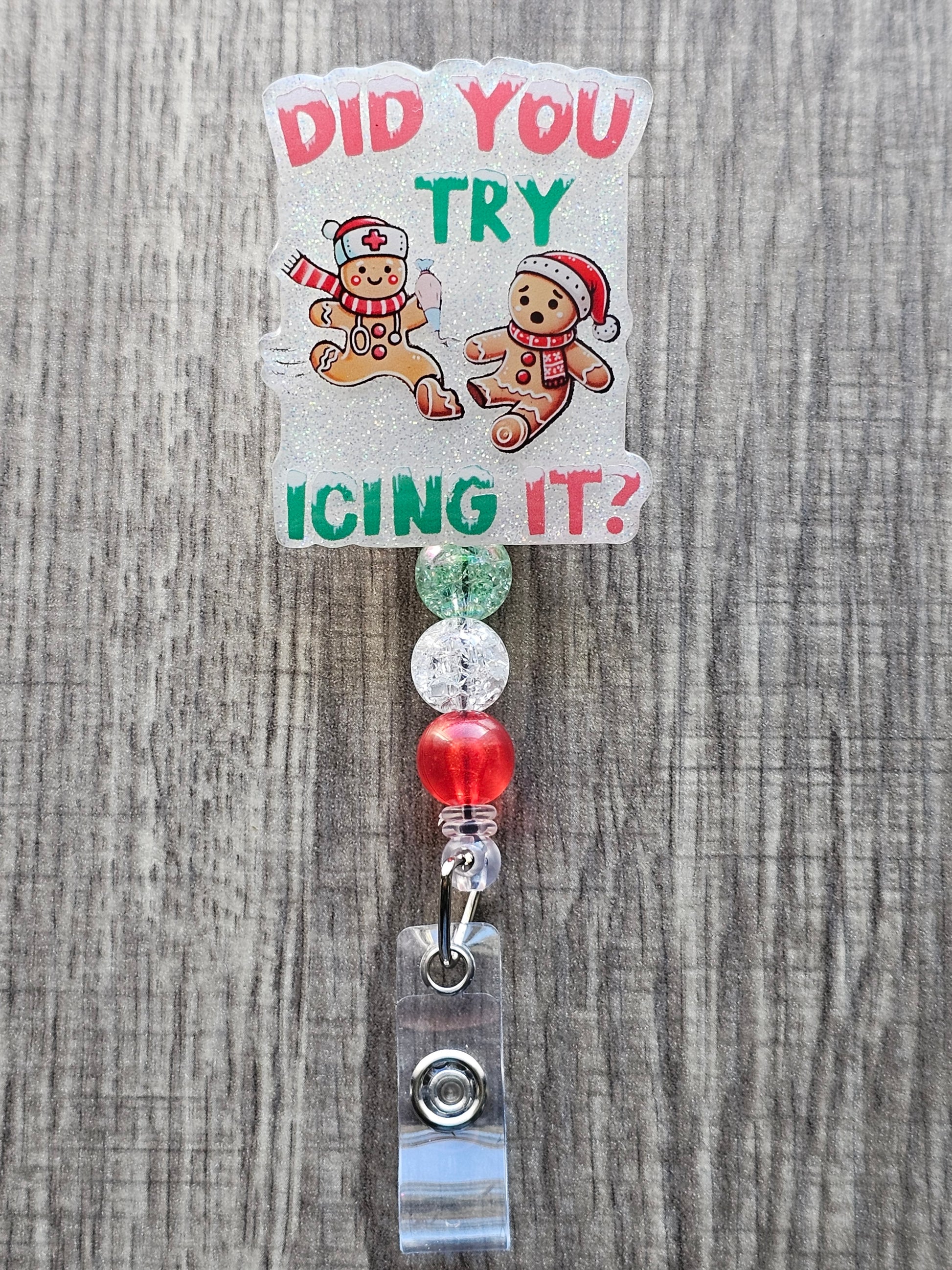 Bring humor and festive charm to your workday with the "Did You Try Icing It?" Badge Reel! Featuring an adorable gingerbread nurse adorned with a Christmas hat, stethoscope, and a playful pun, this design is perfect for healthcare workers who love to spread holiday cheer. Paired with a sad festive gingerbread man with a broken foot, this badge reel combines humor and wit. Ideal for Christmas gifting or personal use, this durable and stylish accessory is the perfect way to show off your holiday spirit with a touch of humor.