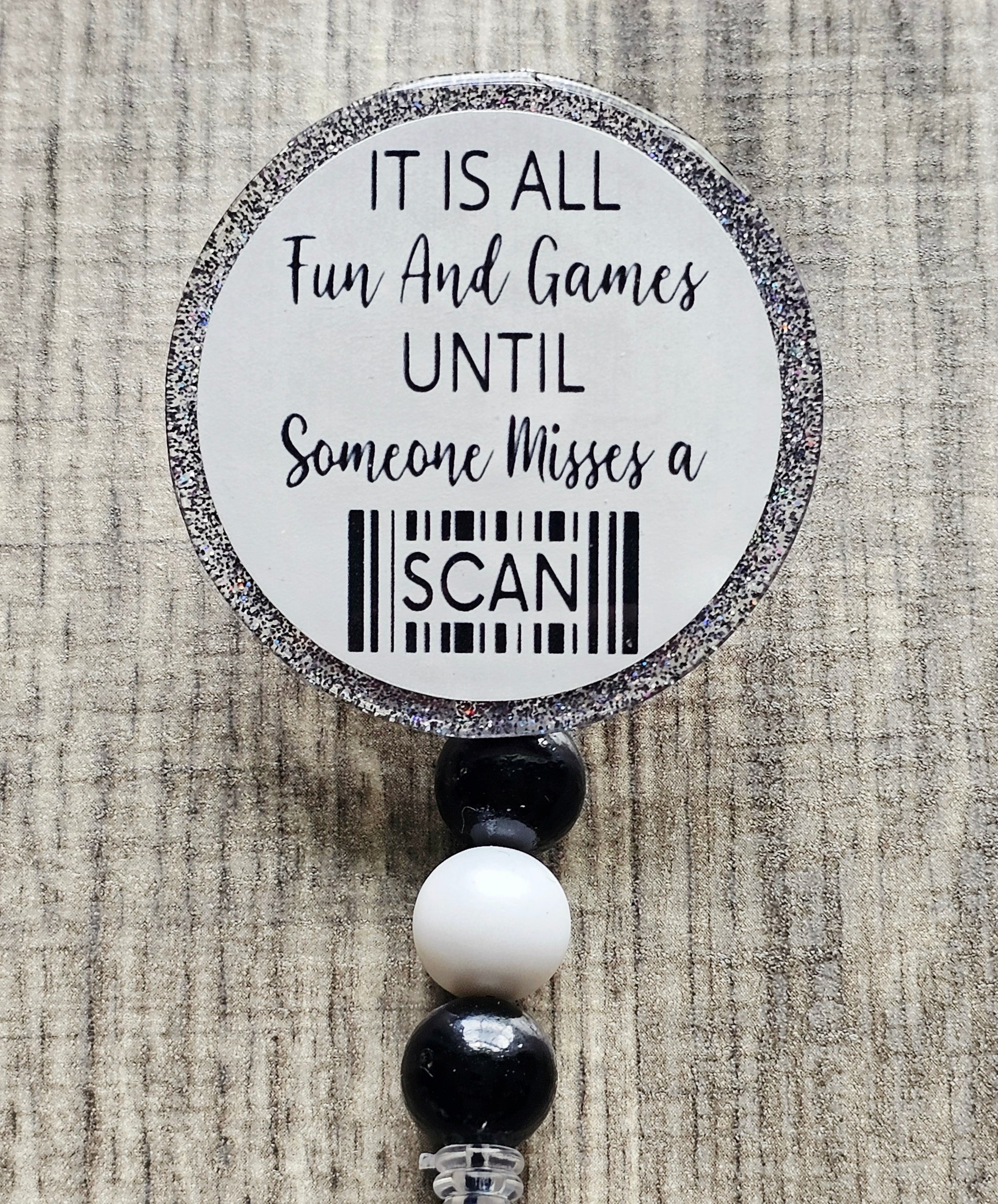 It’s all fun & games until someone misses a scan.” Sound familiar? This badge reel features a barcode-style design surrounding the word SCAN, making it a lighthearted reminder of how serious those missed scans can be.