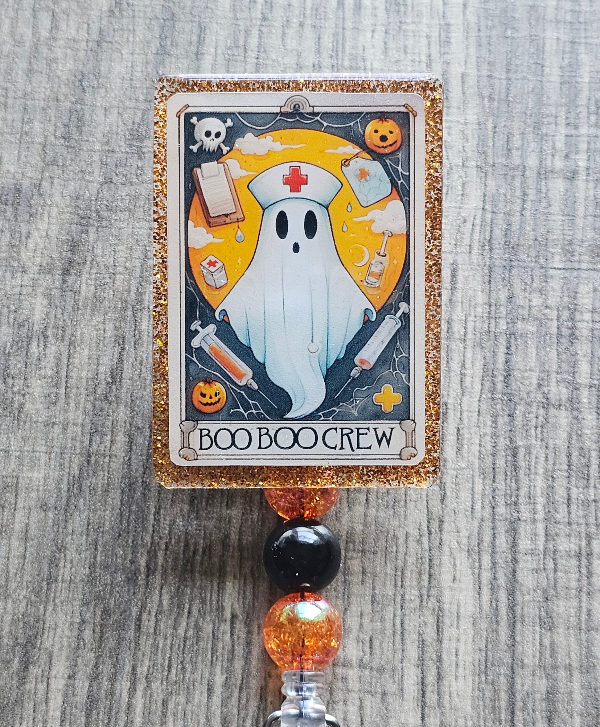 Embrace your spooky side while celebrating the healthcare profession with our Boo Boo Crew Tarot Badge Reel! This unique design features a ghost nurse adorned with a classic nurse hat, syringes, clipboards, and other nursing accessories, all creatively framed in a tarot card style. Perfect for medical professionals who love a touch of Halloween flair, this badge holder is a fun and functional way to keep your ID secure. Whether you're working in a hospital, clinic, or school, let this whimsical design bring a smile to your workday while showcasing your dedication to nursing!
