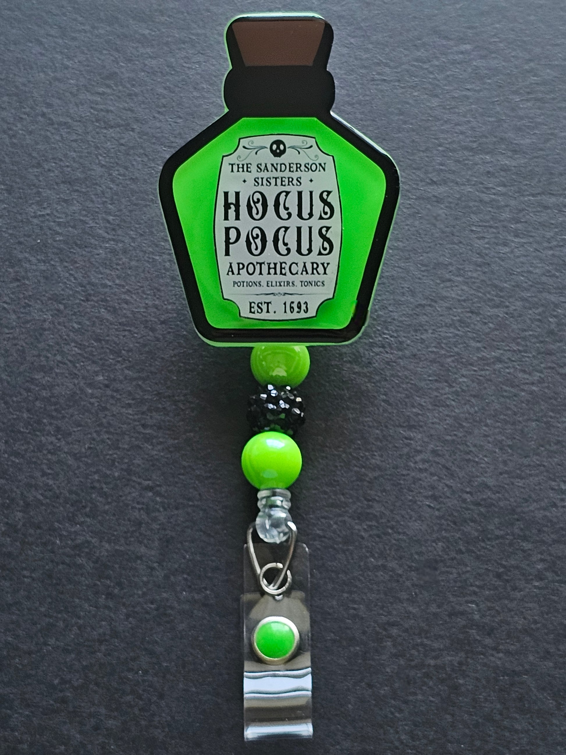 Illuminate your workday with our 'Hocus Pocus Potion' Glow-in-the-Dark Badge Reel! Featuring a vibrant green potion bottle that glows in the dark, this magical accessory adds a touch of enchantment to your daily routine. Perfect for nurses, teachers, and professionals, this whimsical badge holder will keep your ID secure while showcasing your love for all things mystical. Stand out and let your personality shine with this unique, glow-in-the-dark badge reel!