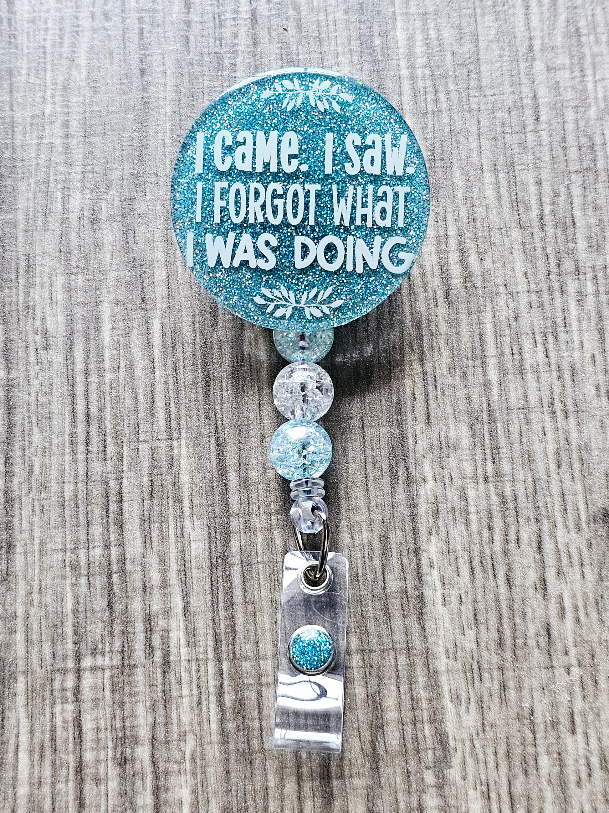 We’ve all been there! The "I Came, I Saw, I Forgot What I Was Doing" badge reel is perfect for anyone who embraces their forgetful moments with humor. Crafted with UV resin, glitter, E6000 glue, acrylic, a sturdy plastic alligator clip reel, and playful plastic beads, this badge holder is both fun and functional.