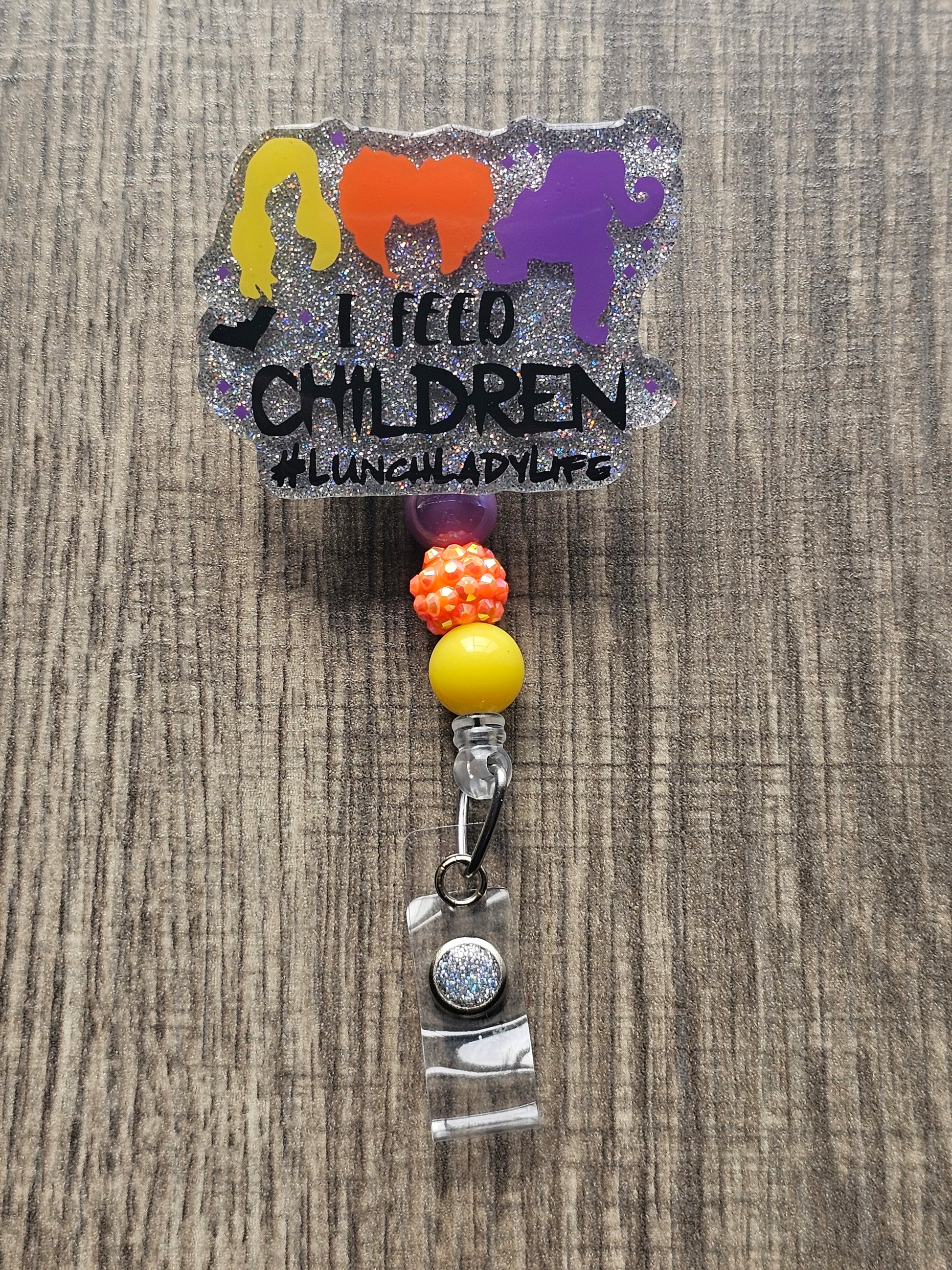 Celebrate your role in nurturing young minds with our "I Feed Children" Badge Reel, inspired by the iconic trio of witchy sisters. Featuring a playful design that showcases three colorful hair silhouettes, this badge reel adds a dash of fun to your workday. Ideal for cafeteria staff, teachers, and childcare providers, this accessory is both functional and stylish. Let your badge holder be a conversation starter, spreading joy and a touch of magical mischief wherever you go. Show off your dedication to feeding the future with this enchanting badge reel!