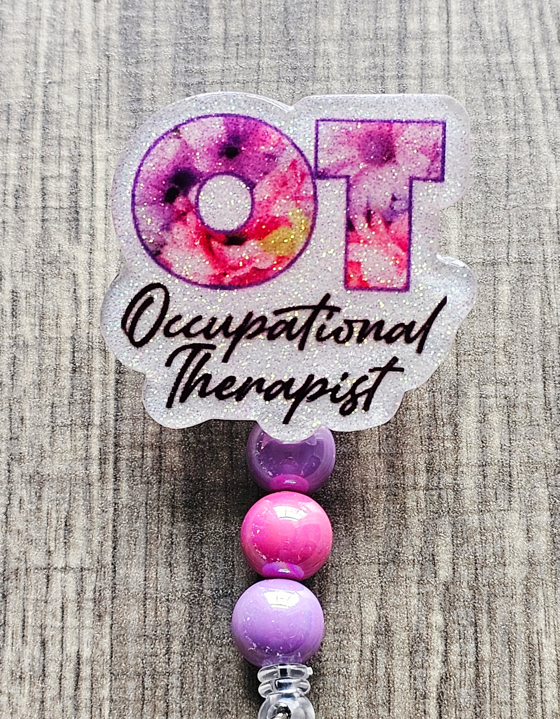 Floral OT Design – Features the letters OT surrounded by a beautiful floral pattern and the words Occupational Therapist over a shimmering white glitter background.