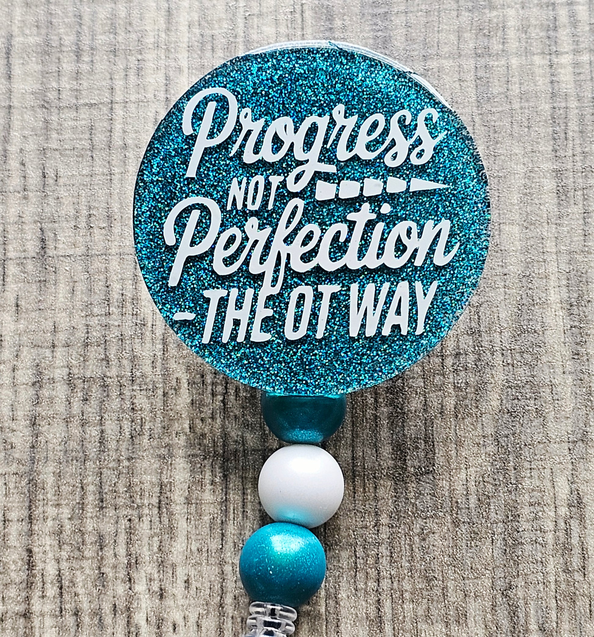 Motivational Quote Design – Set against a calming turquoise background, this reel proudly reads: Progress Not Perfection – The OT Way.