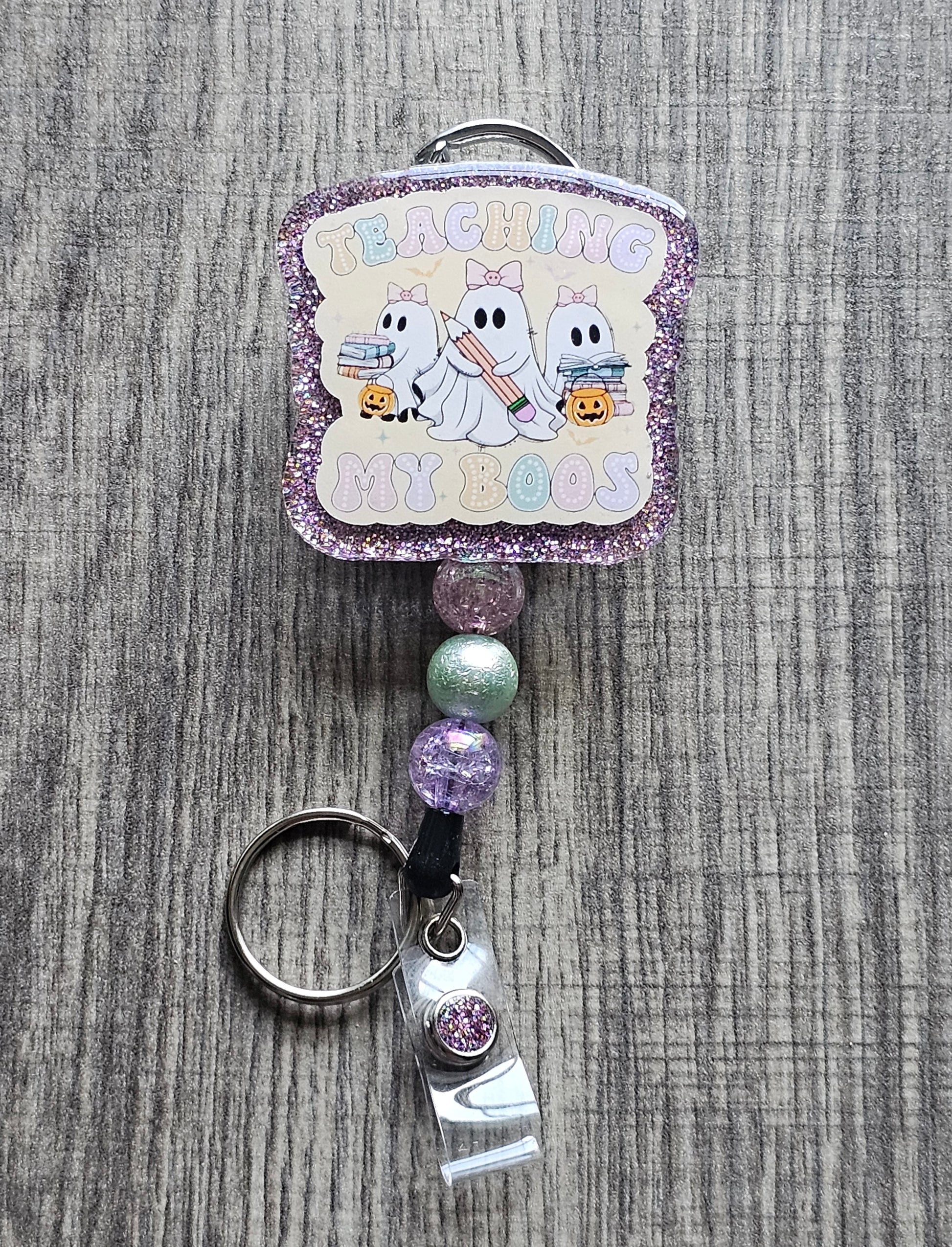 Add some Halloween fun to your classroom with our "Teaching My Boos" Badge Reel! This adorable design features a group of playful ghosts, each sporting bows and incorporating classic school elements like one ghost holding a pencil, while the others carry books and a trick-or-treat jar. Perfect for teachers, educators, or anyone working in a learning environment who wants to celebrate the spooky season while showcasing their love for teaching. This badge reel is not only functional but also adds a festive and playful touch to your daily routine, making it a must-have accessory for October!