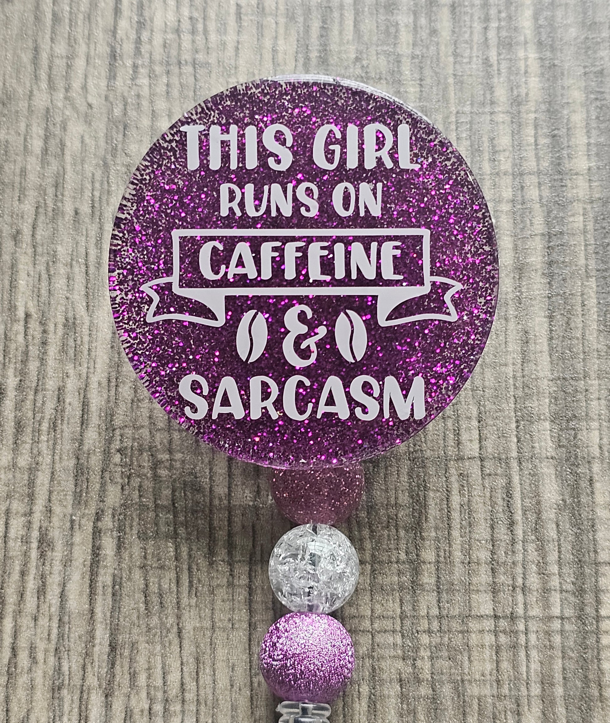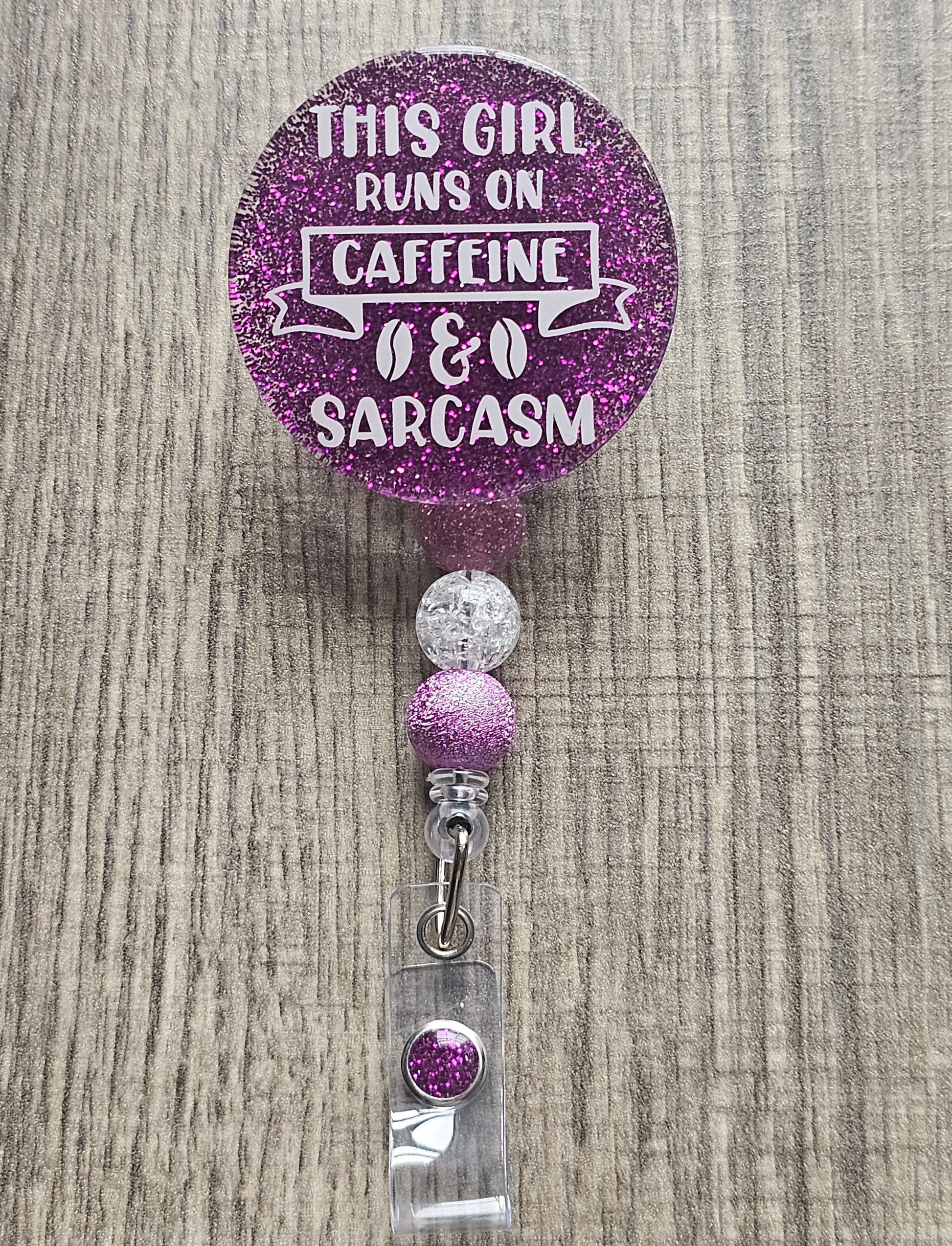 Fuel your workday with a touch of humor! The "This Girl Runs on Caffeine and Sarcasm" Badge Reel is perfect for the coffee lovers who tackle each day with a sharp wit. Featuring a playful design with bold typography, this badge holder adds personality to your daily essentials. Whether you're a nurse, teacher, or office worker, this badge reel will keep your ID secure while showcasing your love for caffeine and quick comebacks. It's a stylish, practical accessory that makes a statement and brings a smile to your face every time you clip it on. Ideal for anyone who embraces a little sass and a lot of coffee!