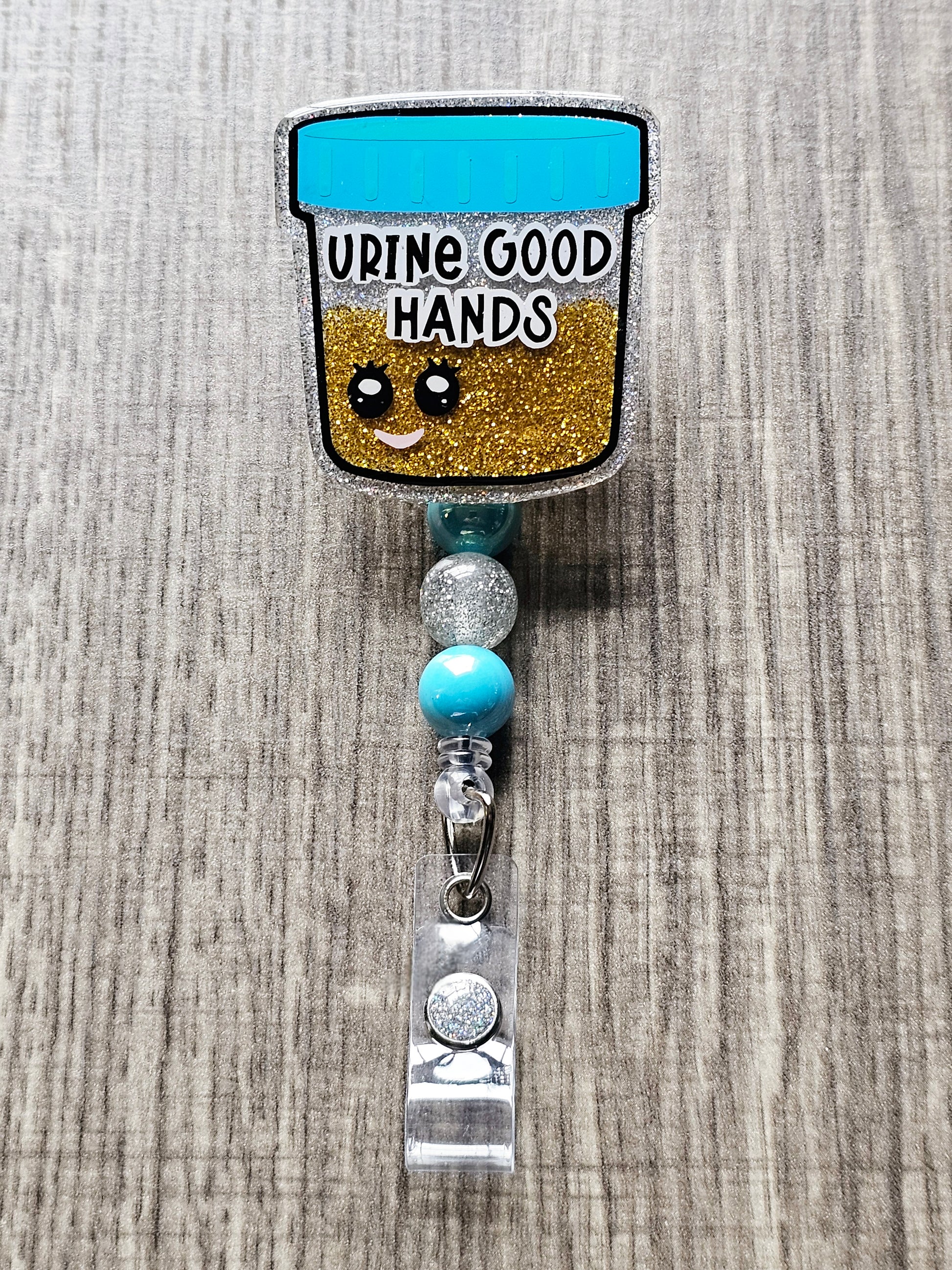 Add some fun to your shift with the "Urine Good Hands" badge reel! This playful design features a smiling urine sample bottle, bringing a lighthearted touch to healthcare professionals. Handmade with UV resin, glitter, E6000 glue, acrylic, a plastic alligator clip reel, and playful plastic beads, this badge reel is perfect for nurses, lab techs, and medical staff.
